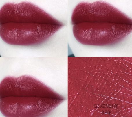 纪梵希334是紫调浆果红,不是哑光质地,涂在嘴唇上不会干,有光泽,很浓郁,显色度也很好。